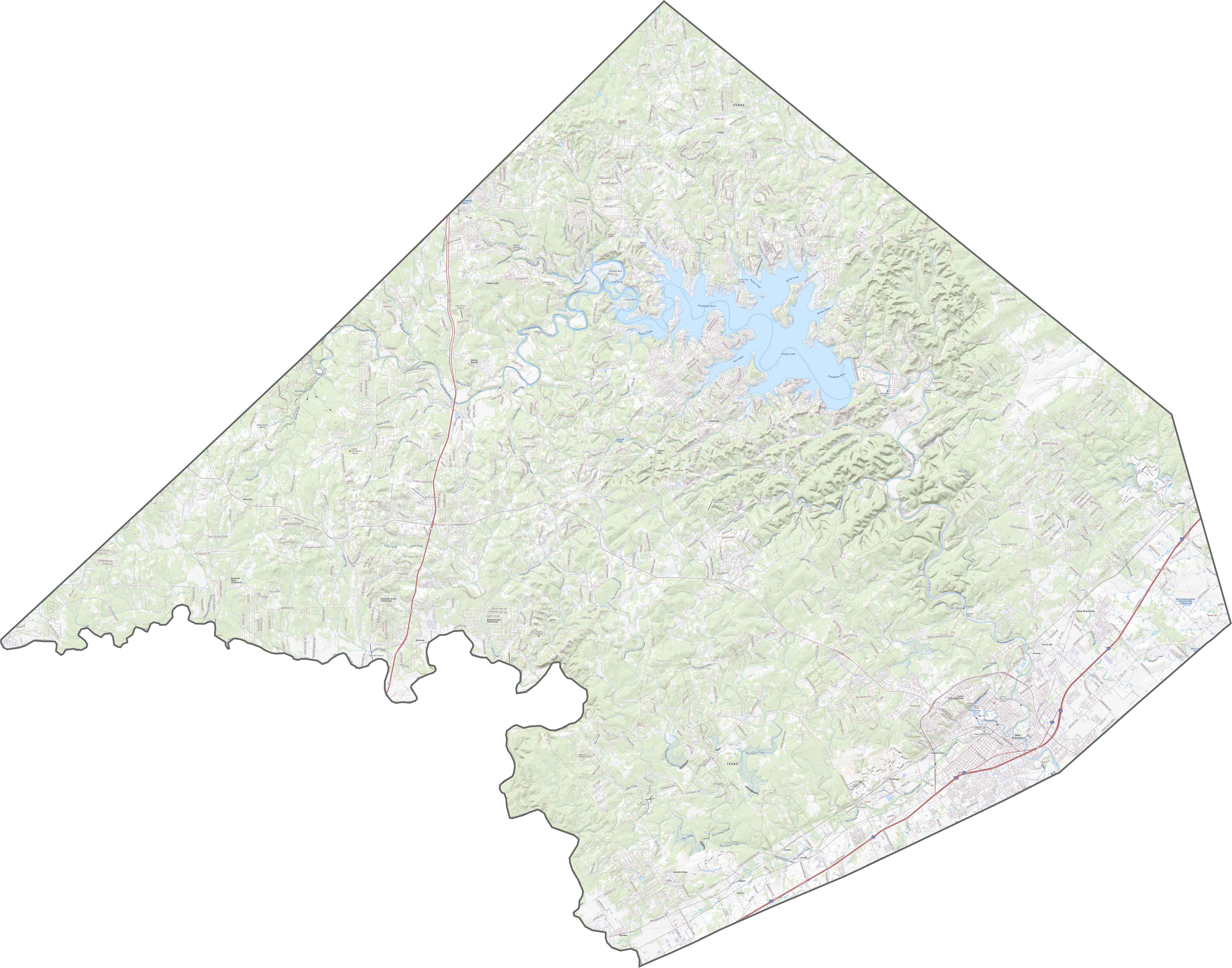 Water features stand out in Comal County, especially Canyon Lake. Central parts are more rugged and covered in scrubby green. Toward the east, it levels out into more developed zones like New Braunfels.