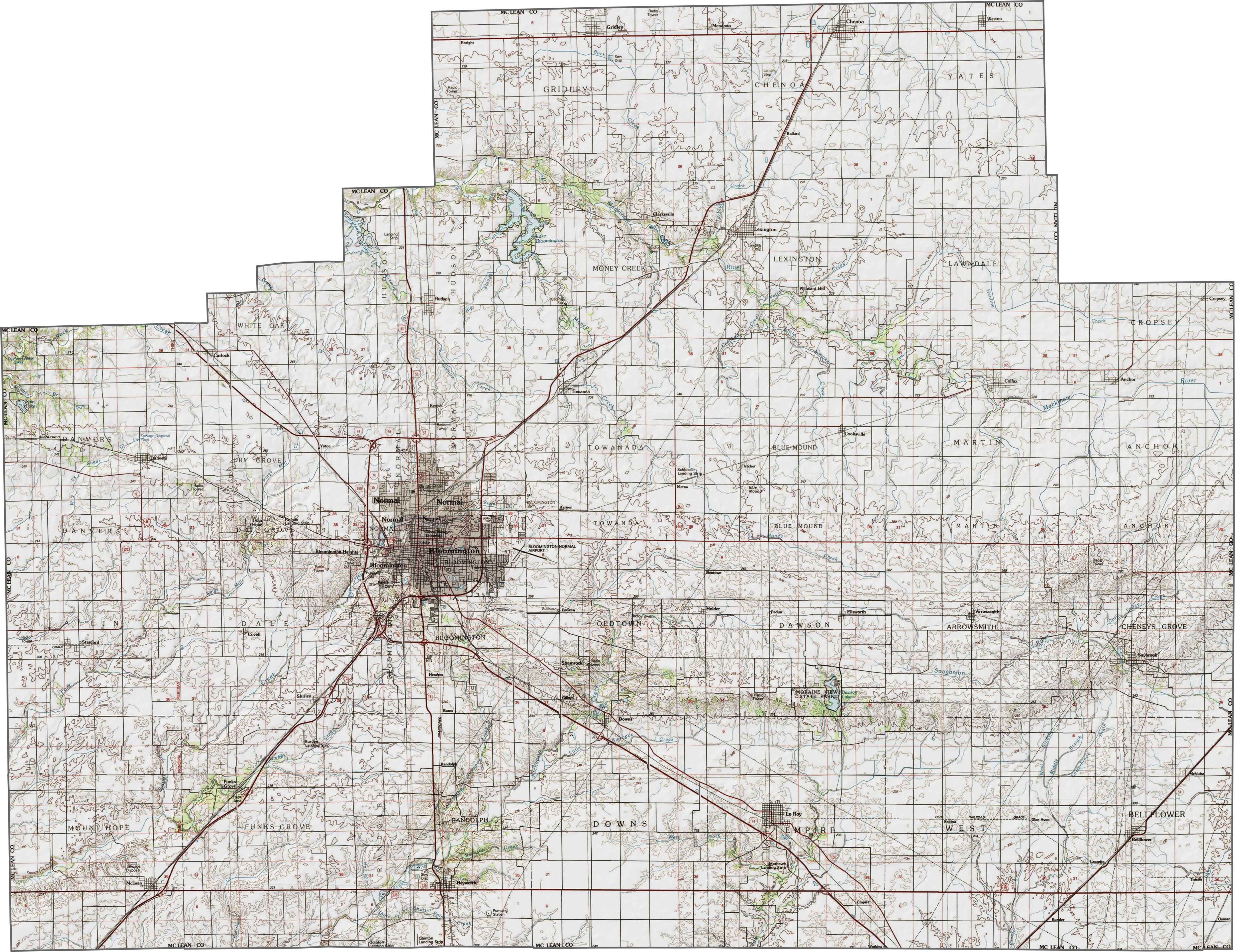 Classic Illinois flatness defines McLean County. Its endless farmland are broken only by small creeks and the twisting Mackinaw River. The terrain slopes gently toward the Illinois River basin. Explore the subtle details with our zoom feature.