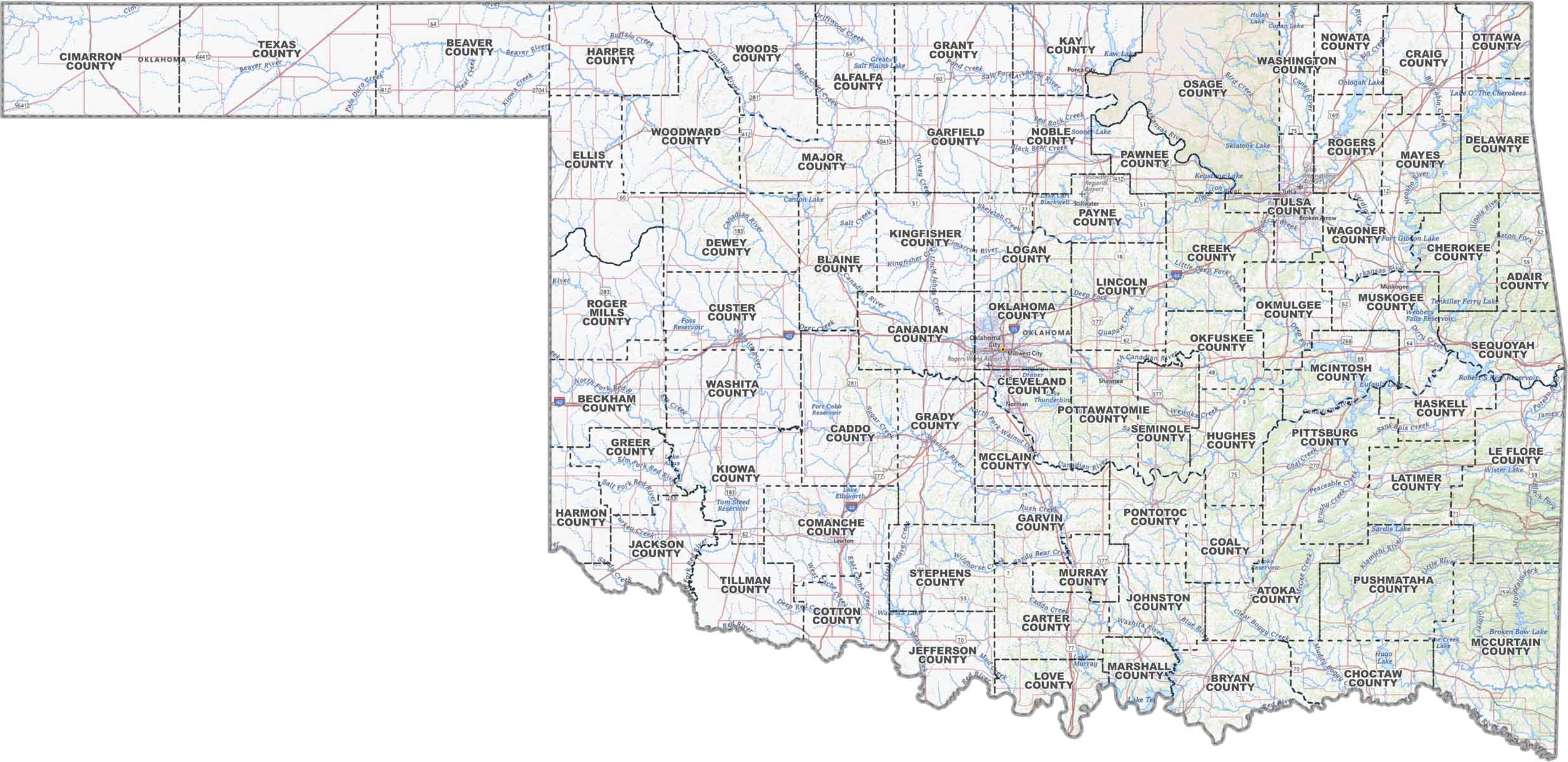 Our map below lays out Oklahoma in full detail. But the two main features are its county lines and topographic information like roads, lakes, rivers, and cities.