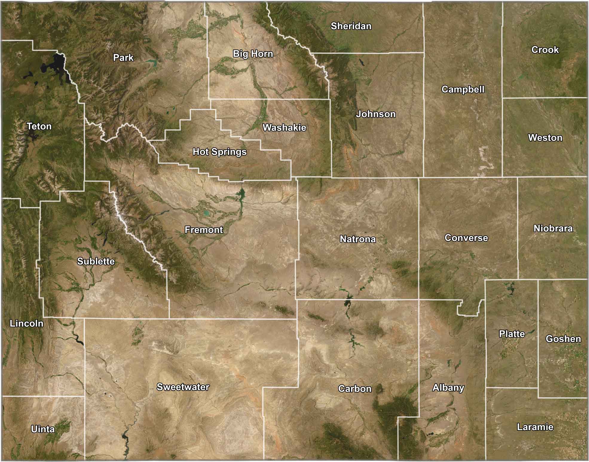 Wyoming is all raw land. Out satellite map shows off its mountains, plains, plateaus, and just enough towns to remind you people live here. The best part? County lines show you how the state is divided.