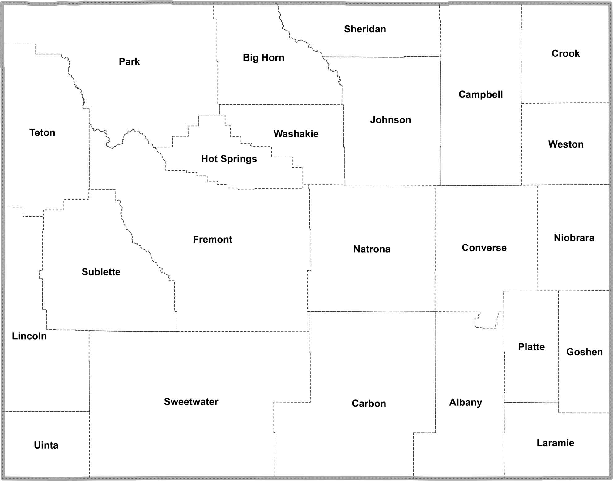 Straightforward and clean. Wyoming’s county lines are all you’ll see here, labeled and laid out without extras. Just the basics, for when you want structure.